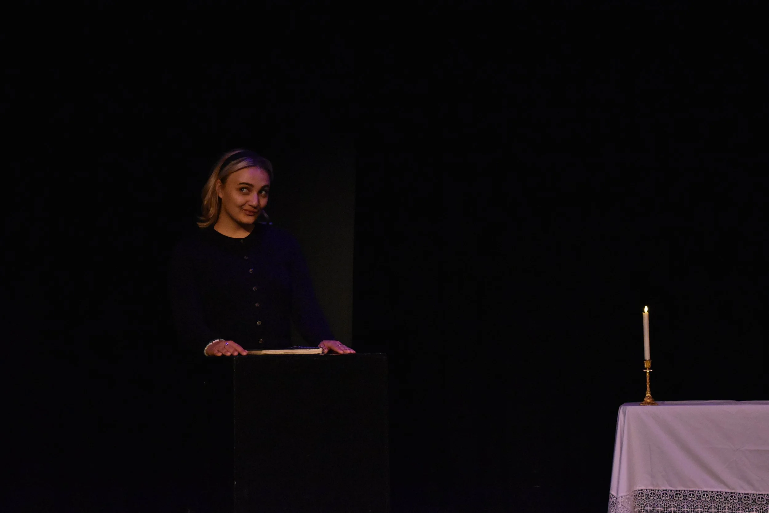 Picture of Abby as Kennedy in the NYU Tisch Broke People Festival Production of And So I Killed The Leviathan.